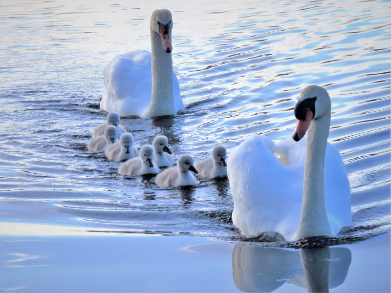 A proper family portrait of the parent Mute Swans with their seven cygnets.