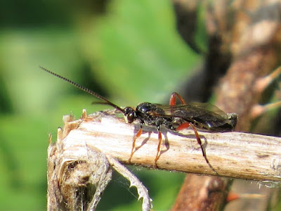 The red insect with long antennae that I photographed yesterday is a species of Ichneumon. The way it was sitting made the 'wasp-waist' hard to see. It might be Netelia infractor, a largely nocturnal species sometimes found in moth traps and a predator on many moth species. As usual there are 'other similar species'. Thanks to Martin Adlam for pointing me in the right direction.
