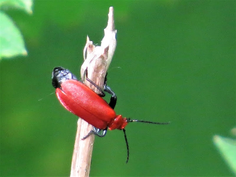 As yesterday a beetle that has climbed to the top of a dead stick and is wondering what to do. One of the so-called cardinal beetles this is Pyrochroa serraticornis. It has a red head. A closely-related species has a black head but is otherwise very similar. The angle is not good to see its 'serraticornis' - serrated antennae.