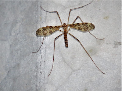 A most odd-looking cranefly I found on a street lamp pole pre dawn. It looks as if a child has been let loose with a crayon to imagine the wing pattern. I think its is probably one of the Ptychopteridae or Phantom Craneflies. Only two of the nine UK species are illustrated on the internet.