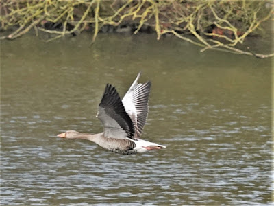 One of the pair of Greylag Geese that flew off. Note the feather damage to its right wing.