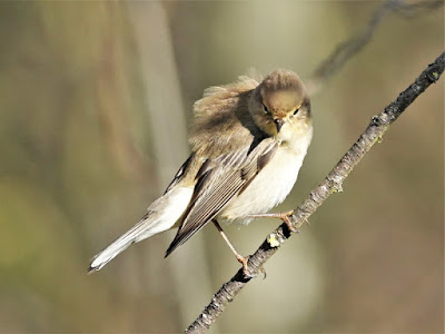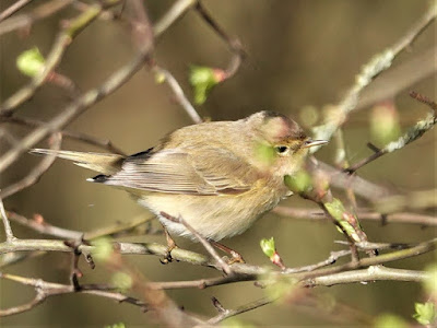 Many Chiffchaffs were allowing themselves to be photographed. This was a non-singing bird and therefore possibly a female. The brownish legs might suggest it is a Willow Warbler. This can be ruled out by the lack of strong pale eyebrow. Visually it was clearly a Chiffchaff as it was continually dipping its tail as it moved through the vegetation. Willow Warblers are slightly heavier and move much more deliberately. Very few bird guides tell you this.