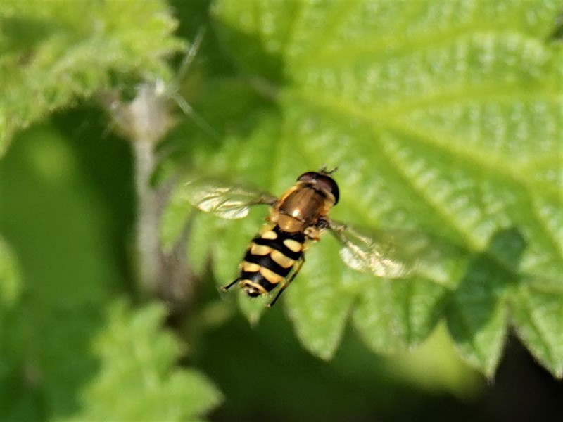A hoverfly hovering. It is one of the 'difficult pair' Syrphus ribesii / S. vitripennis.