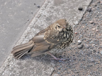A juvenile Song Thrush living dangerously. It is sitting on the kerb of Castle Farm Way, just a few feet from the passing traffic.