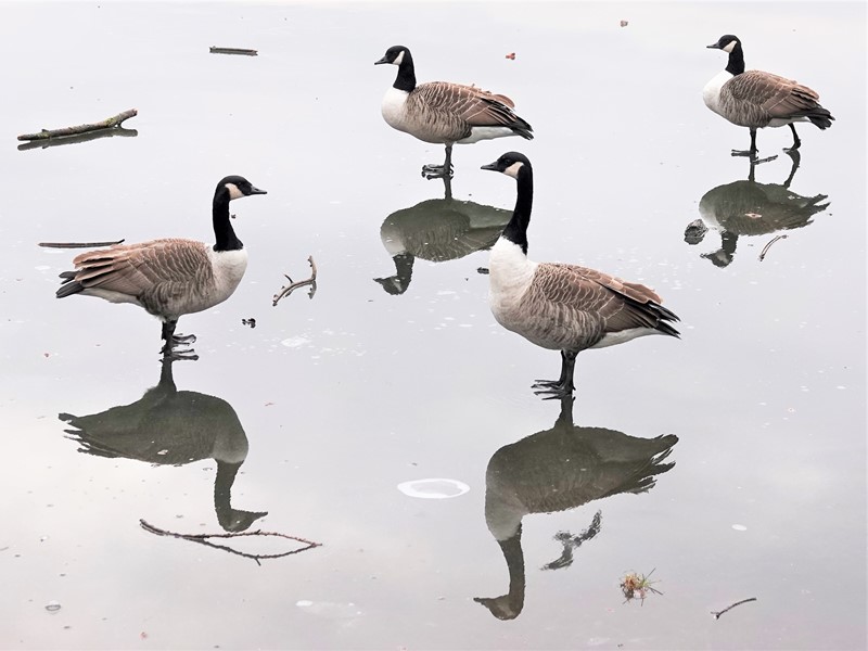 Answer this quickly. How many Canada Geese are there here? An upside-down Black-headed Gull is also visible.