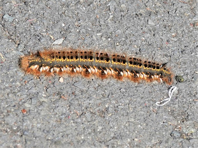 Another Drinker moth caterpillar Euthrix potatoria , this one easier to photograph. I was not about to risk touching the hairs to remove the detritus from the photo though I did use a large leaf to remove the caterpillar from the middle of the footpath.