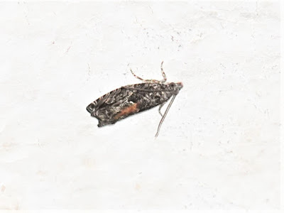 A dreaded Box-tree Moth Cydalima perspectalis: my first in Shropshire. First recorded in the UK in 2007 and the West Midlands in 2017 this is an invasive species that originates from East Asia. It was likely accidentally imported as larvae in with Box Buxus plants as part of the horticultural trade. The larvae often destroy all the leaves of Box plants in many parts of the UK. It may be the only reason to welcome the Yellow-legged Asian Hornet Vespa velutina to out shores as it is thought this predator controls the natural Asian population of the moth. [Not really: the hornet could wipe out our native bees]. Despite the moth's very different appearance it is closely related to our grass moths.
